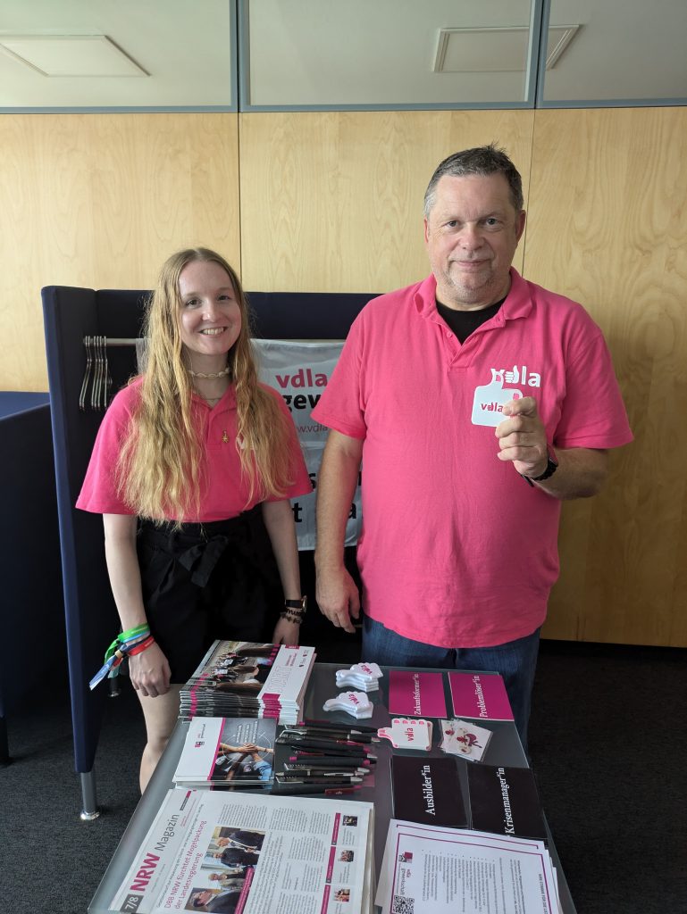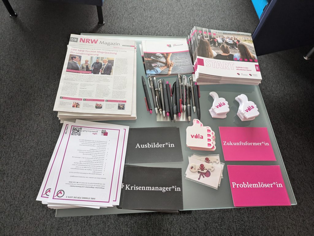 Die neuen RIAs und RSAs der Bezirksregierung konnten im Rahmen ihrer Einführungswoche an einem Informationsaustausch in der Metrostraße teilnehmen. Hier haben sich neben verschiedenen Dezernaten und dem Personalrat auch verdi, Aufbruch sowie wir uns vorgestellt. Die Anwärterinnen und Anwärter zeigten auf dieser Info-Veranstaltung nicht nur ein reges Interesse für Ihre zukünftigen Ausbildungsgebiete, sondern besuchten genauso fleißig unseren Infostand.